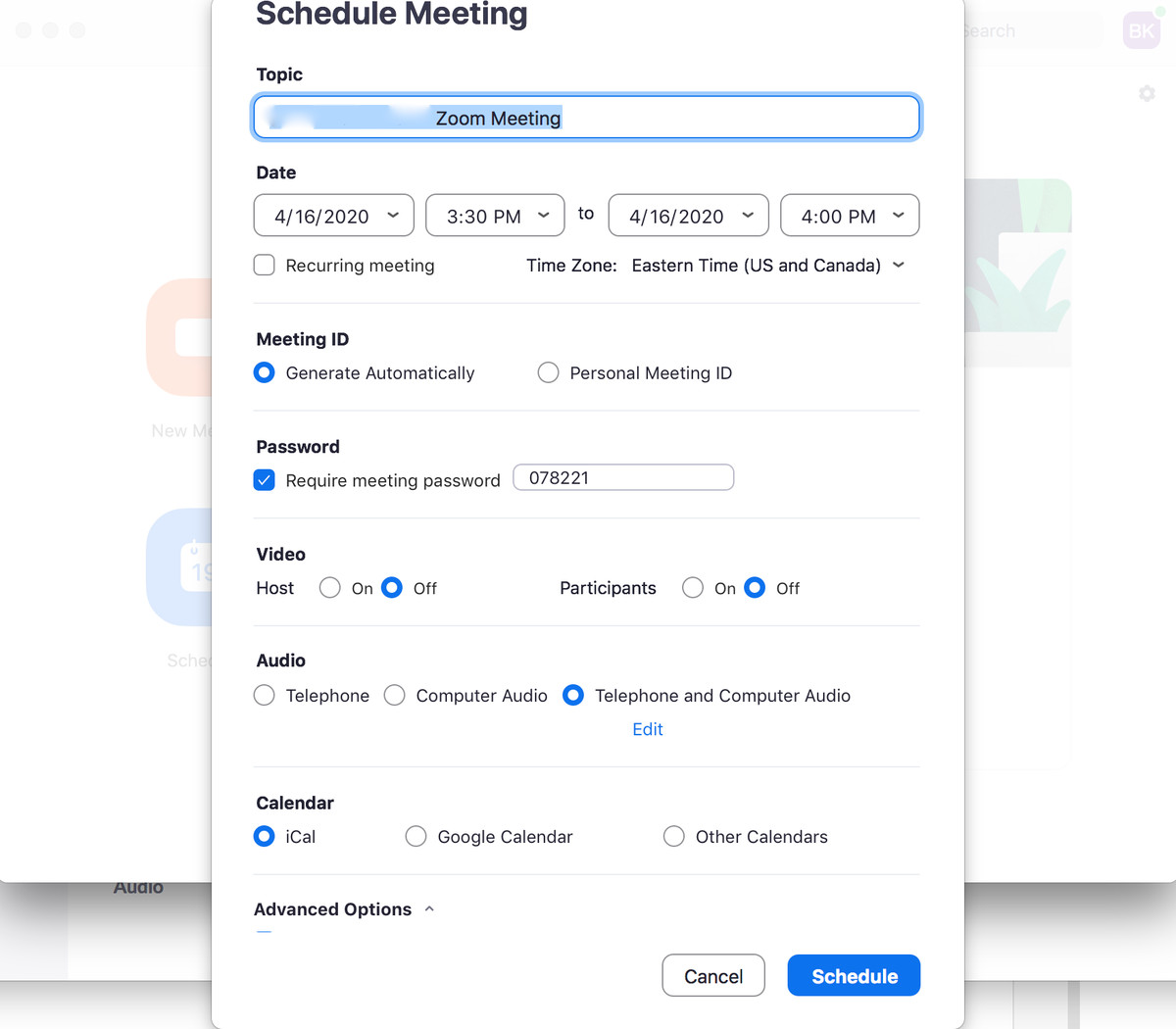 - You will be offered essentially the same selections as you are in the web app. If you want to make sure the waiting room is enabled, click on “Advanced Options” at the bottom of the page.