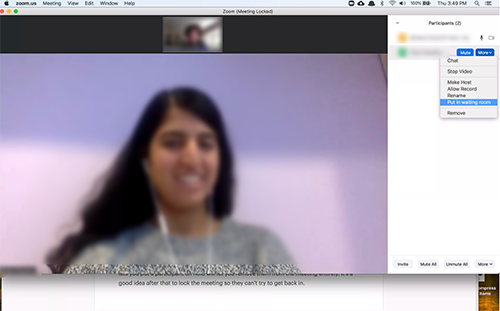 One handy feature is that you can put people back in the waiting room. You may need to discuss a birthday present or a confidential part of the meeting so you can click ‘Manage Participants’ icon at the bottom of your screen. Find the names of the participants you wish to put in the waiting room and click ‘More’ > ‘Put in waiting room’. The participant will no longer have access to the meeting. In effect, they will be back in the waiting room until you decide to let them return.
