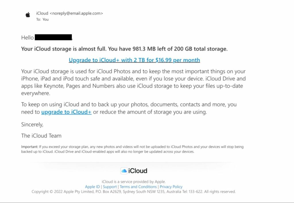 We can see the sender’s address is @email.apple.com the correct spelling and capitalisation of iCloud are used throughout and the email is addressed to the recipient and uses their name (we have blocked out the name for privacy reasons).