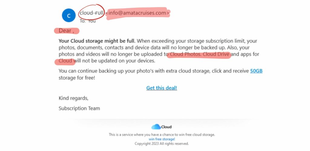- Spelling/design errors: Although the examples above don’t have spelling or grammatical errors, the first example does have errors in it’s use of iCloud, spelling it without an i. This is a clear sign of a scam email.