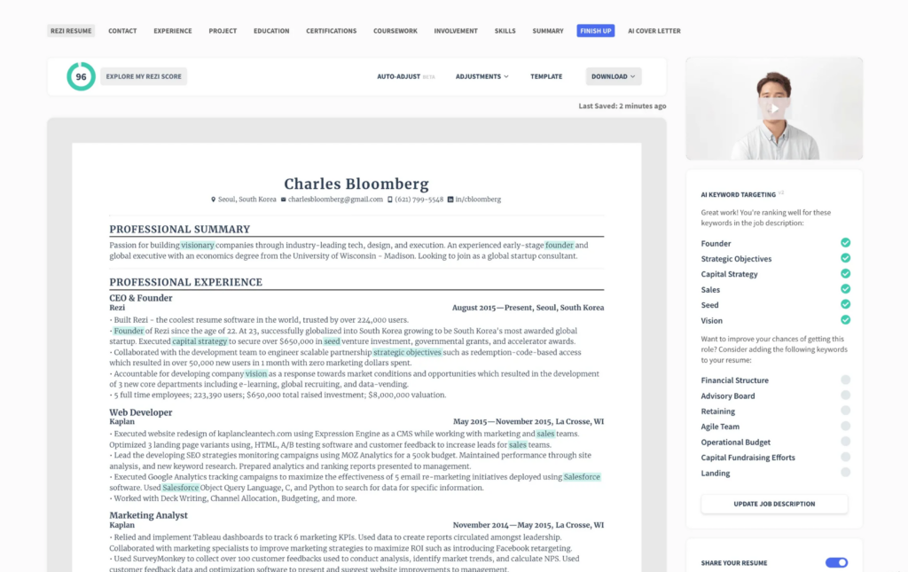 Now that you’ve got your LinkedIn profile picture sorted thanks to AI, why not use another AI-powered tool to aid in crafting your CV or cover letter? Rezi has a completely free option to help create your resume. Use the built-in templates so your resume passes automated systems. Simply fill in some prompts about your previous work experience, the role you’re applying for and any relevant experience or qualifications and AI will do the rest!