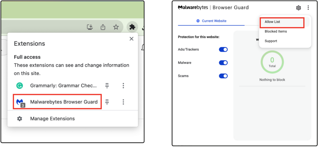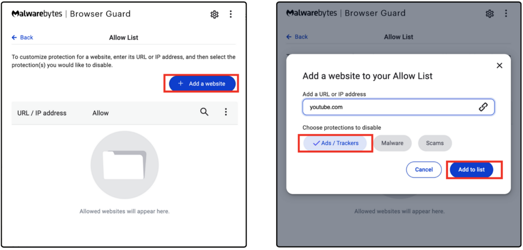 If you’re using Google Chrome as your web browser, click the jigsaw piece to view your plugins, select Browser Guard, tap the settings cog and select allow list. Click Add a website and type in Youtube.com.