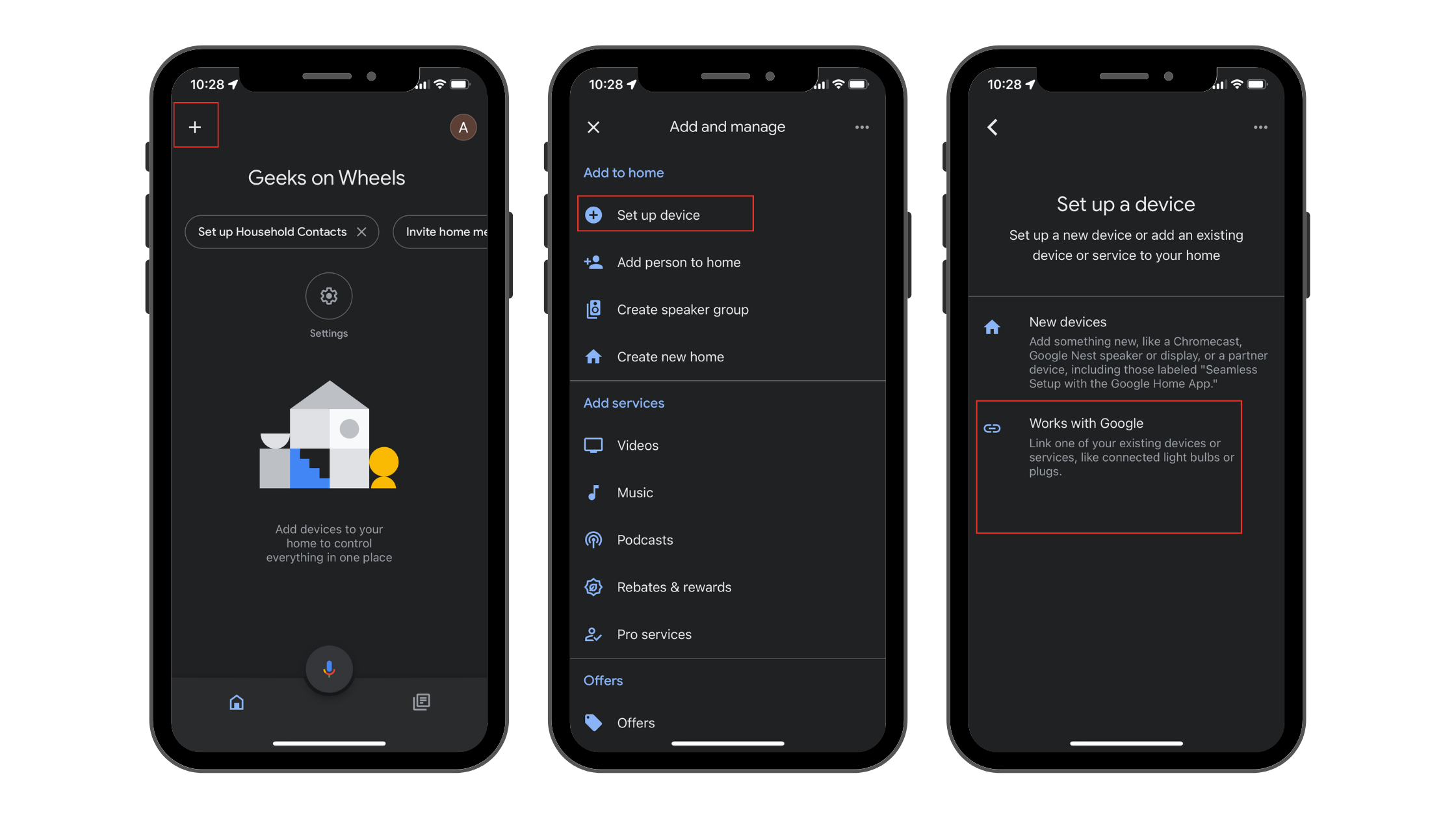 - Once the app is downloaded, open it and tap the ‘Add +’ button. Then hit ‘Set up device +’ and select ‘Works with Google’, and select the device from the list.